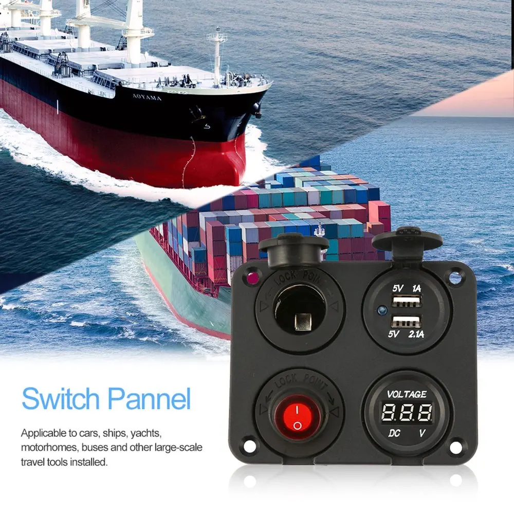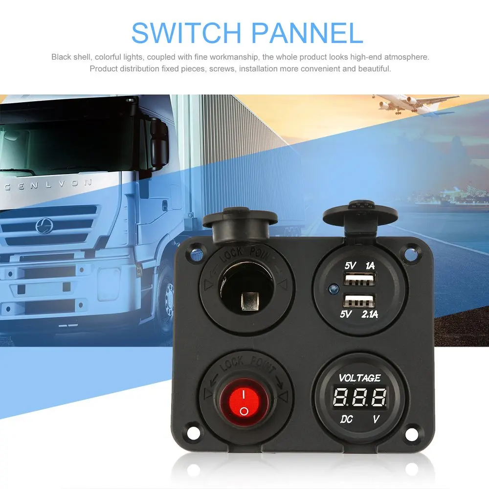Dual USB Ports Car Charger + LED Voltmeter + 12V Power Socket + On-Off Switch 4 in 1 Car Marine Boat LED Switch Panel